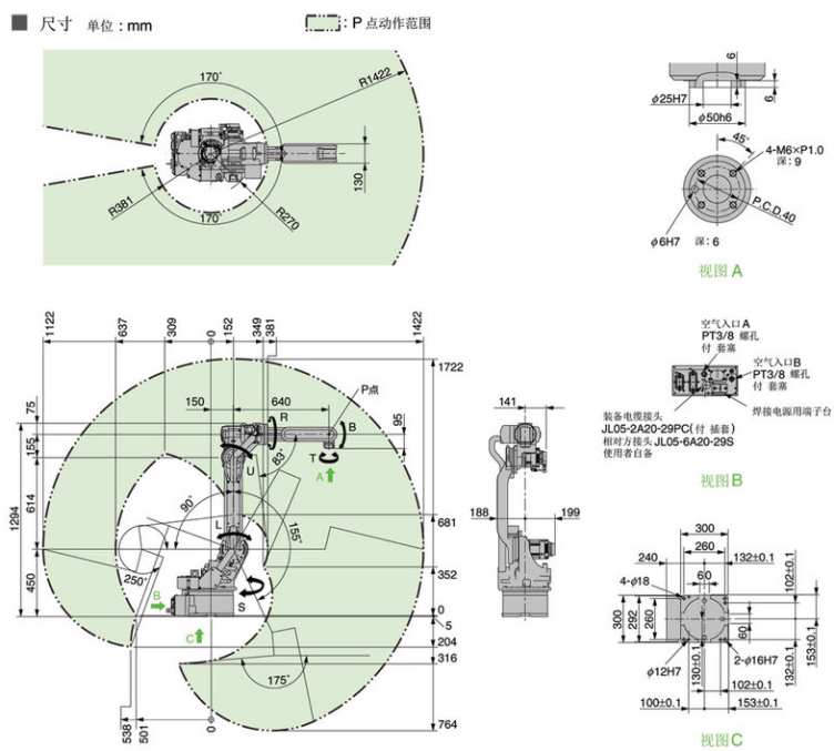 安川MOTOMAN-MH6为6轴机器人,放置方式既可以地装也可以壁挂和吊装。